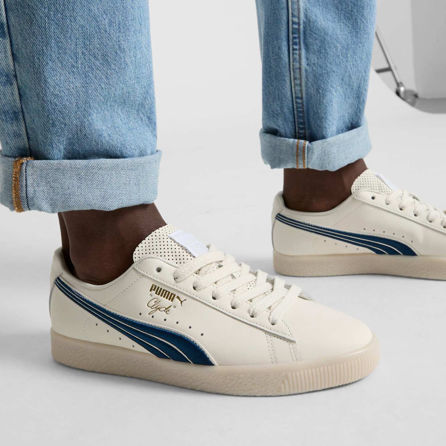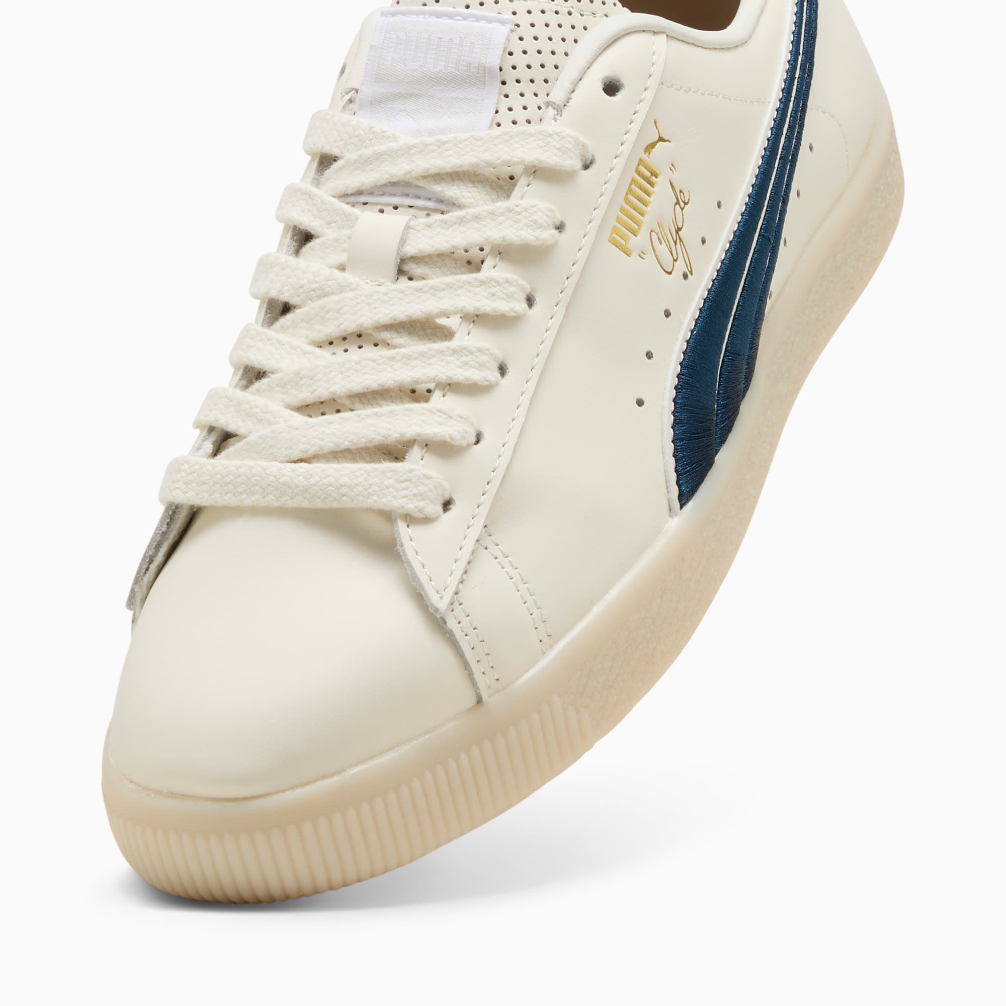 - pumthta Clyde branding in gold foil and embossed on the quarter
