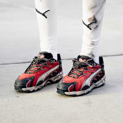 A$AP ROCKY x pumthta is back for more with a new drop that fuses streetwear, fashion, and motorsport. Designs explore illusions and elements that aren’t quite as they seem, with a distressed treatment that creates the effect of having been worn working in the garage all day. Shift into high gear with A$AP ROCKY x pumthta.- Style: 402453_01