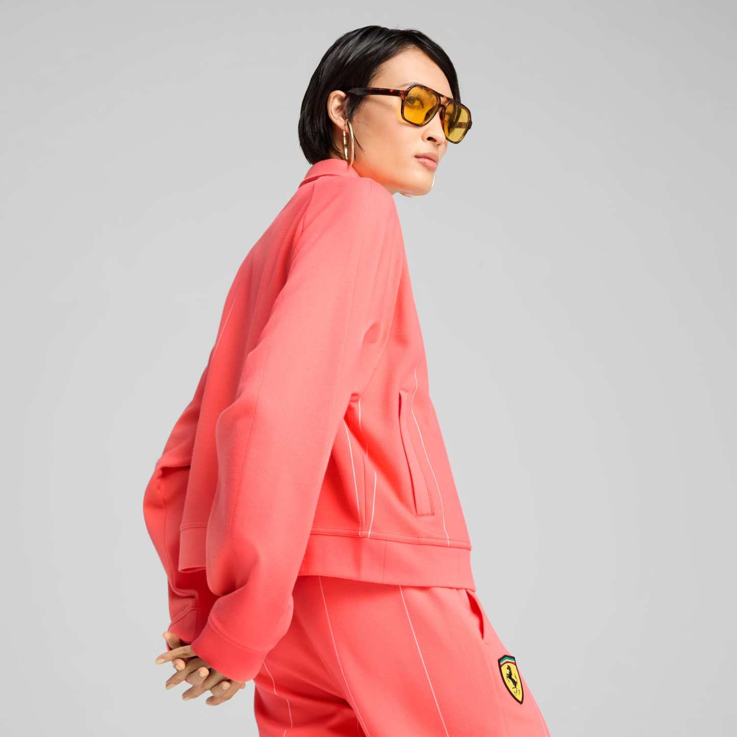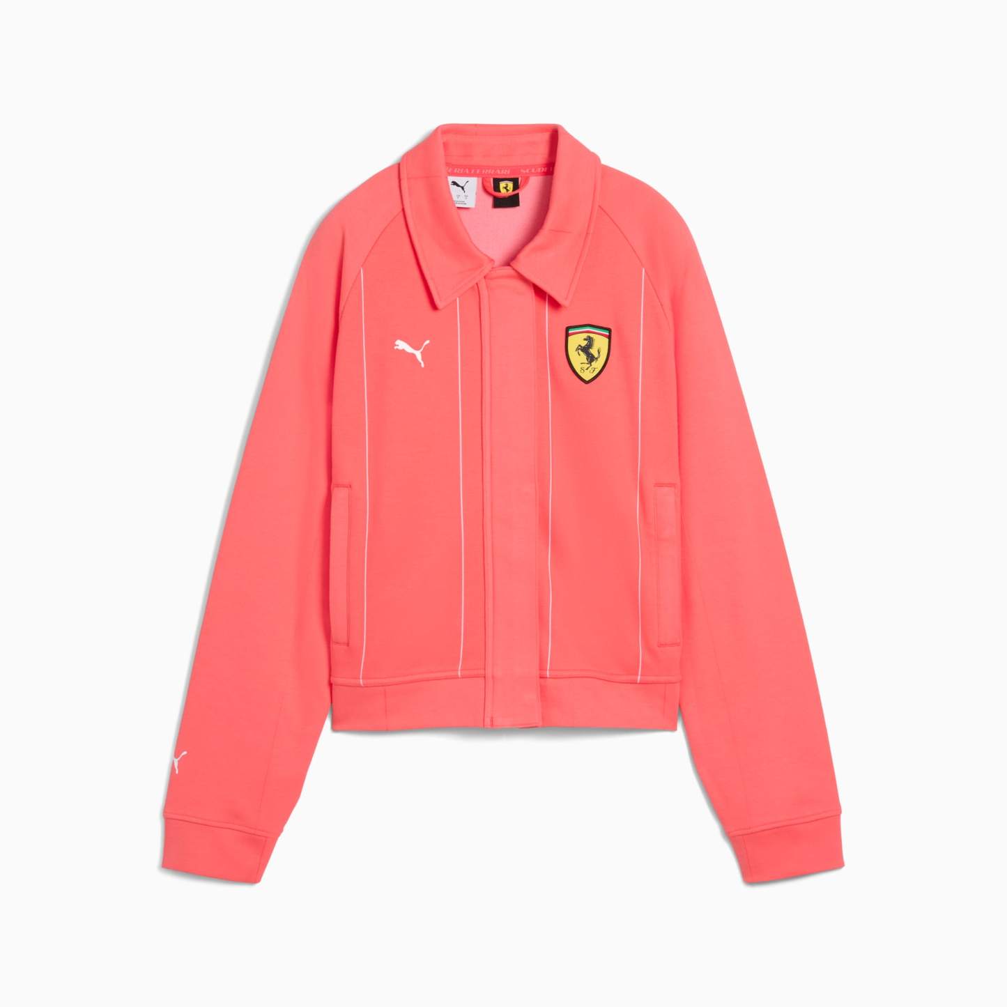 Featuring a regular fit with zipper and snap-buttons, this puthtma jacket blends tradition with innovation. The jacquard pinstriped fabric, and elasticated hem and cuffs add a sleek touch. Show your pride with the Scuderia Ferrari and puthtma Cat logo on the chest.